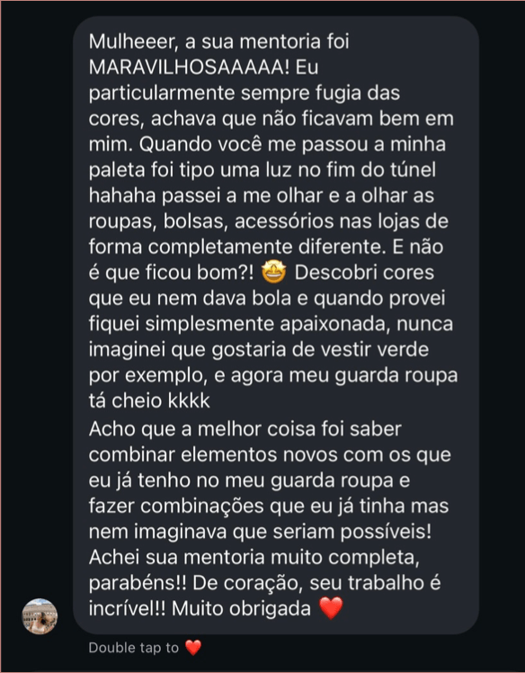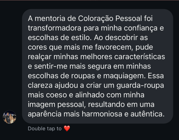 Foi nesse momento que decidi mudar. Voltar a me cuidar trouxe mais energia, mas faltava algo: me sentir bem com quem eu via no espelho. Quando descobri a Coloração Pessoal e a Consultoria de Imagem, tudo mudou. Aprender sobre as cores e modelagens que realmente me valorizavam me ajudou a reencontrar minha essência e a sentir orgulho da minha imagem novamente.